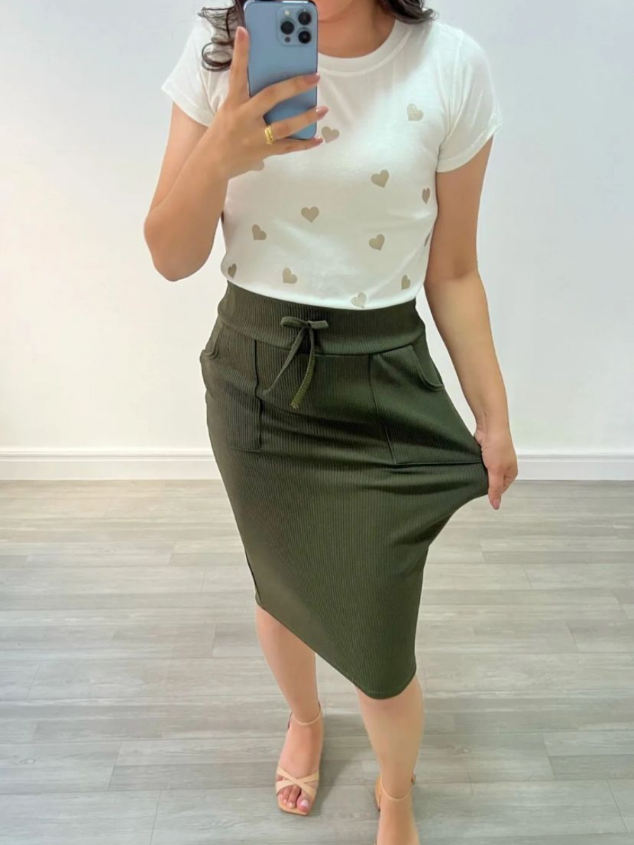 Seja o primeiro a avaliar “Saia Casual Anarruga (Verde Militar)”