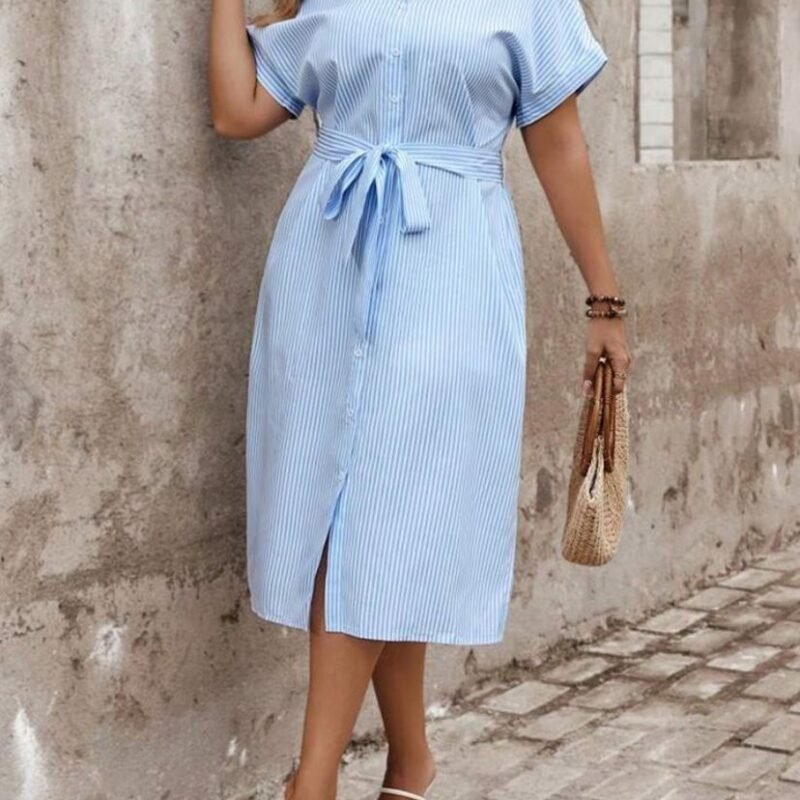 Franclia Vestido Camiseta Listrado Plus Size Feminino com Cintura Marcada, Conjunto Feminino Longo de Verão