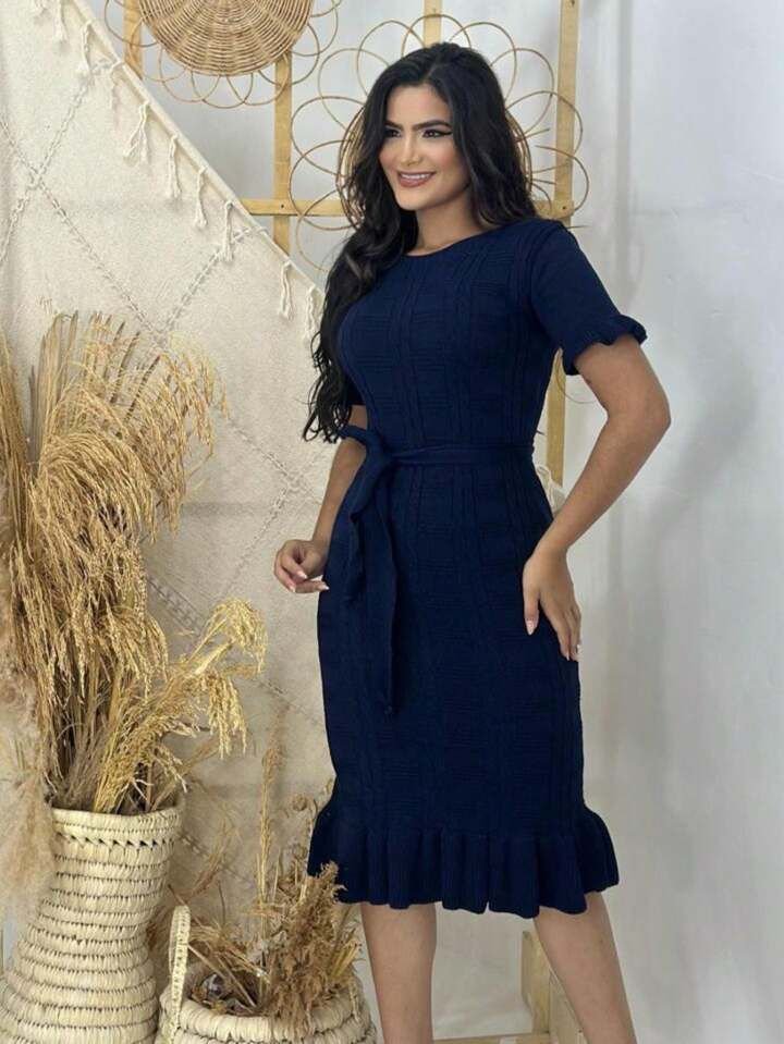 Vestido de Trico Midi Trança Babado com Cinto Casual Malha Tricot
